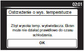 temperatura. Zalecane jest wówczas obniżenie temperatury w kabinie lub temperatury przy wyświetlaczu centralnym i zapobieganie bezpośredniemu padaniu światła słonecznego na wyświetlacz. |