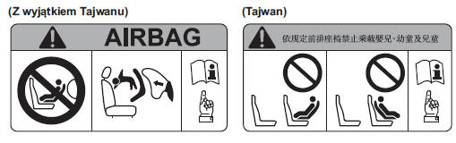 (Tajwan, z wyjątkiem siedzenia pasażera przedniego, jeśli samochód posiada poniższą etykietę) Umieszczone w widocznym miejscu naklejki przestrzegają przed używaniem na siedzeniu chronionym poduszką powietrzną fotelików dla dzieci montowanych tyłem do kierunku jazdy.